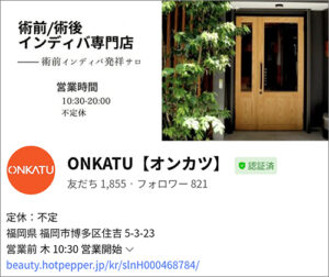 当店のSNSをご覧いただき有難うございます、日々、ONKATU【オンカツ】はインスタグラムやTwitter、グーグルマイビジネスにも最新情報をお届けしています。主にインスタグラムを中心に施術例など発信しておりますので、併せてご覧くださいませ。